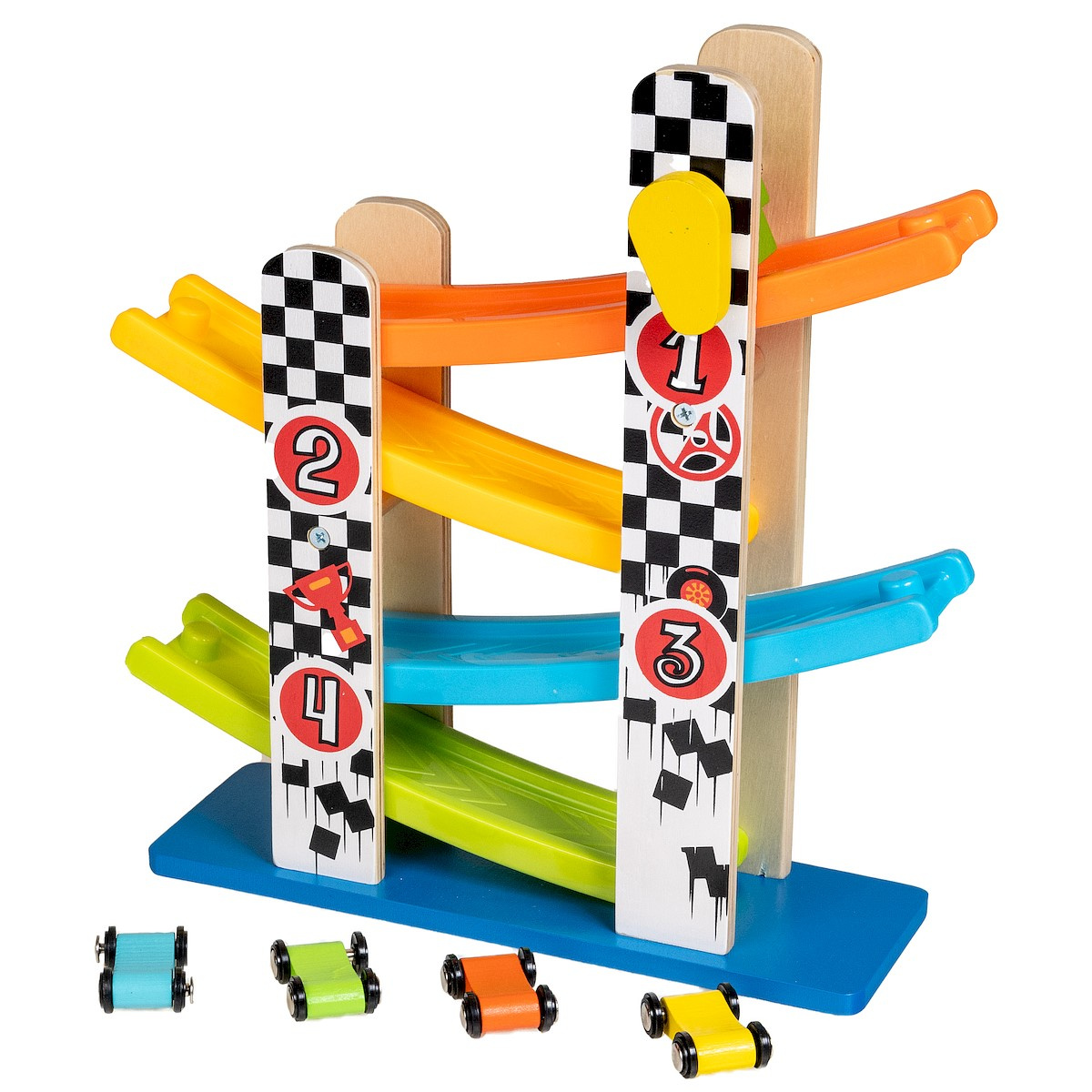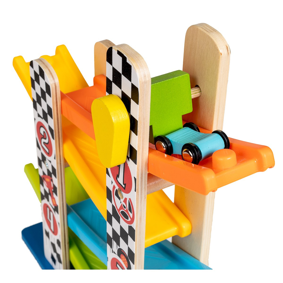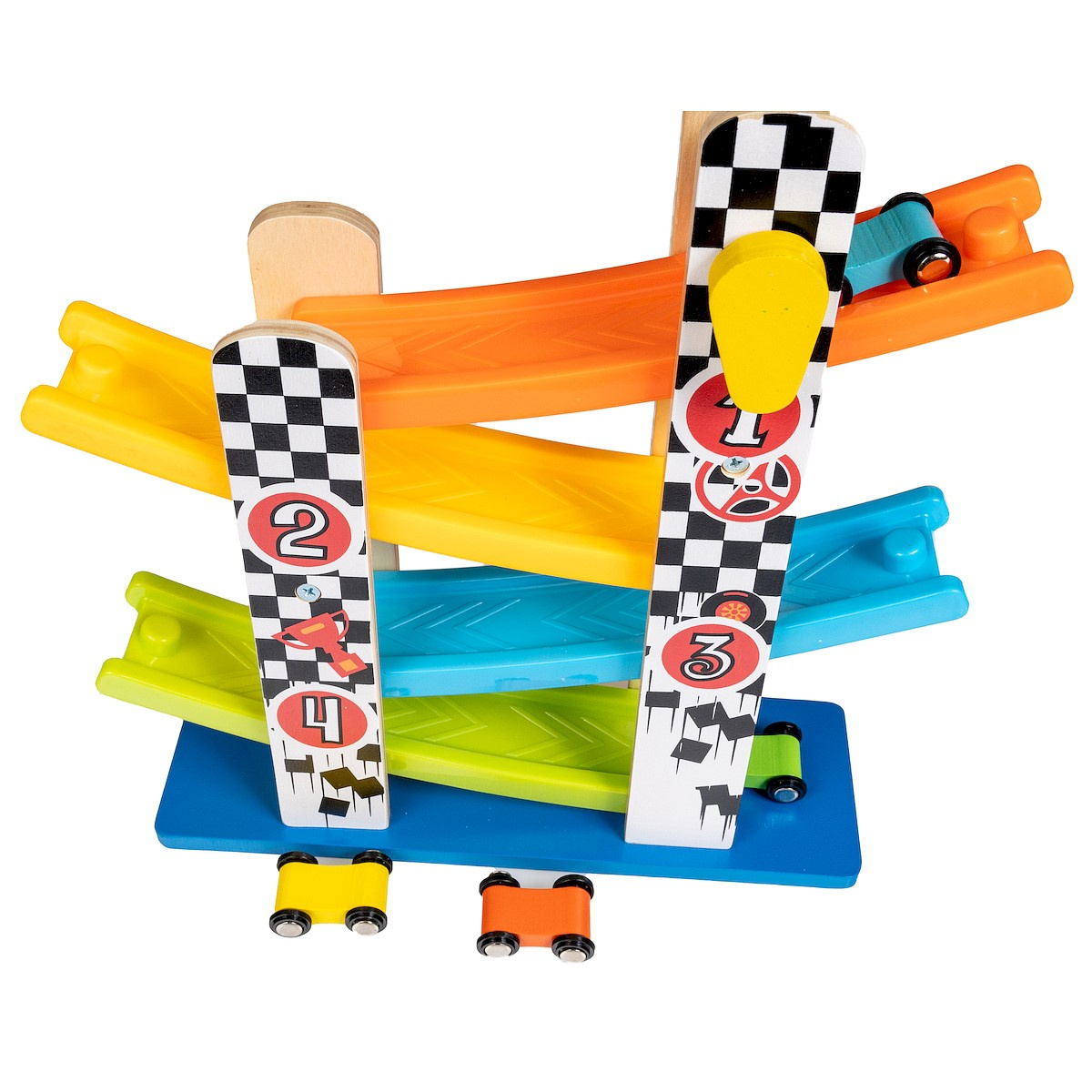 Ustawiając auto na najwyższym poziomie zjeżdżalni, dziecko może obserwować, jak zjeżdża ono ku dołowi. Tor wyścigowy dla dzieci jest skonstruowany tak, że wszystkie cztery auta mogą zjeżdżać jeden po drugim. Podczas zabawy można podziwiać akrobacje małych wozów i imponującą prędkość.