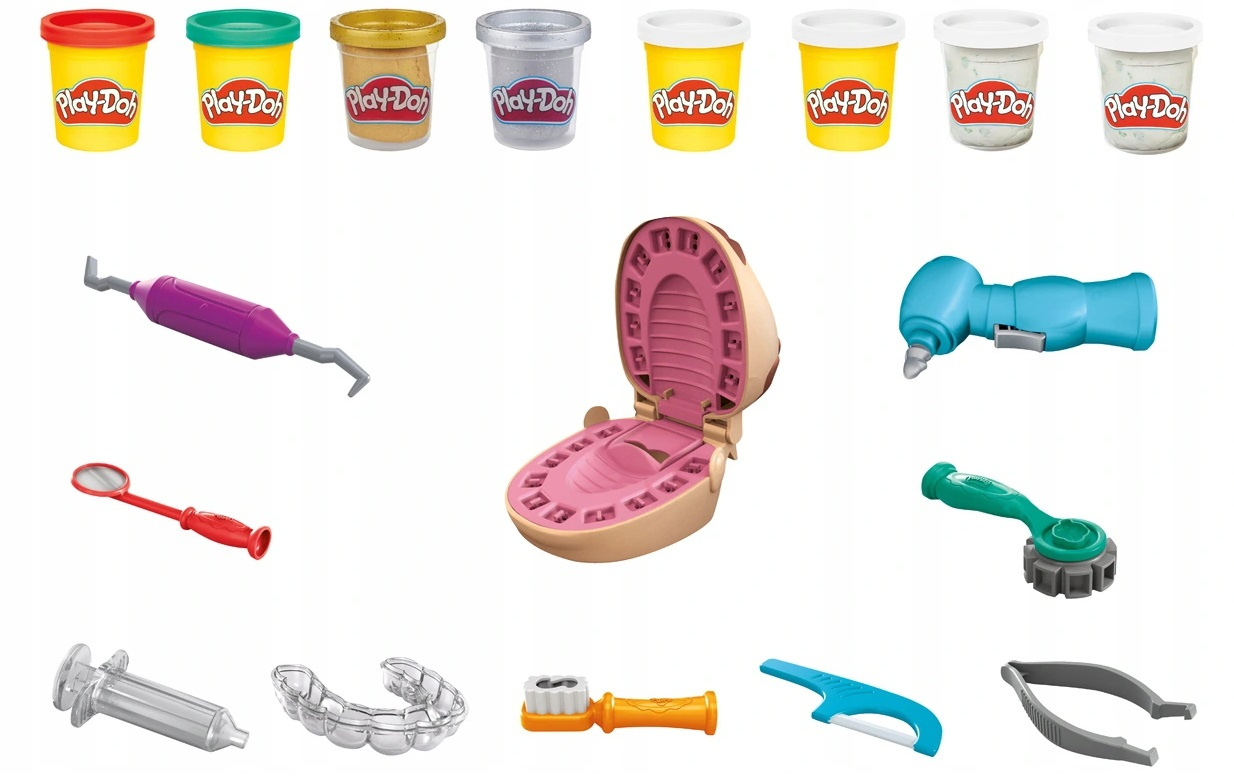 - Ze specjalną ciastoliną z kolorowymi drobinkami i złotym oraz srebrnym kolorem możesz tworzyć zęby wymagające leczenia, aparaty ortodontyczne i plomby, a dzięki nowemu wiertłu niewymagającem