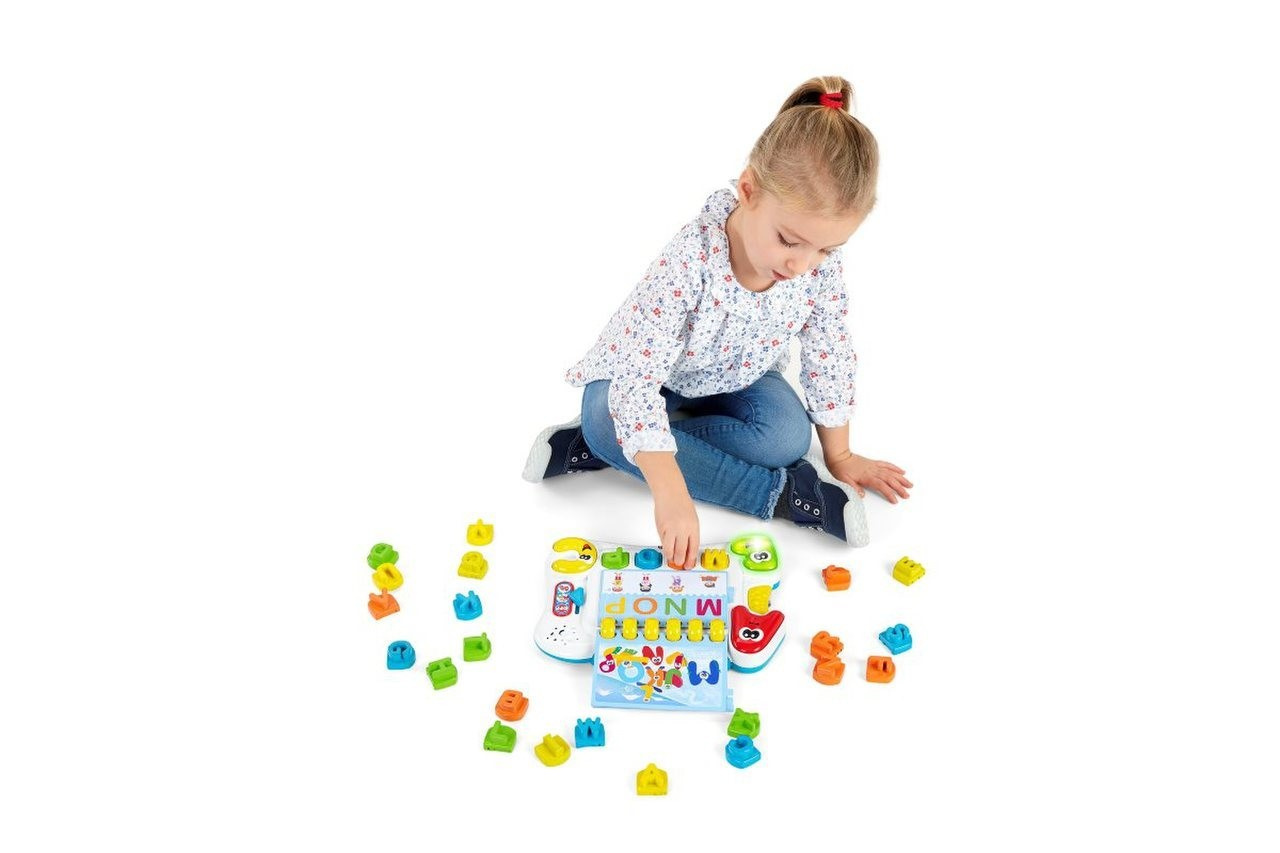 - tryb ABC - dziecko umieszcza literę we właściwym otworze, zgodnie z ilustracjami na otwartej stronie książeczki, a zabawka uczy je nazwy i poprawnej wymowy. Zabawka posiada funkcję autokorekty: rozpoznaje, czy litera została umieszczona we właściwym miejscu,