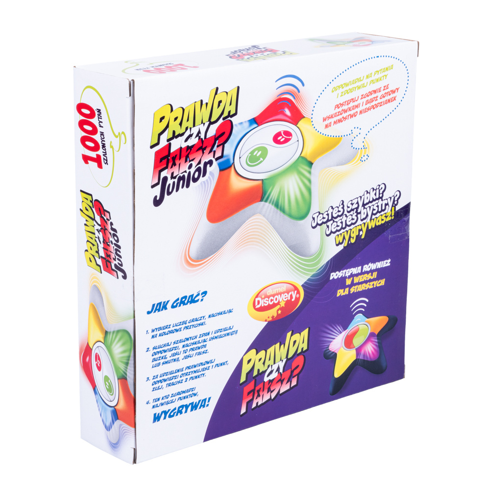Nowa wersja popularnej zabawki Prawda czy Fałsz stworzona z myślą o najmłodszych. Wariant junior wyposażony został w łatwiejsze pytania tak, by każdy Maluch poradził sobie z udzieleniem na nie odpowiedzi.