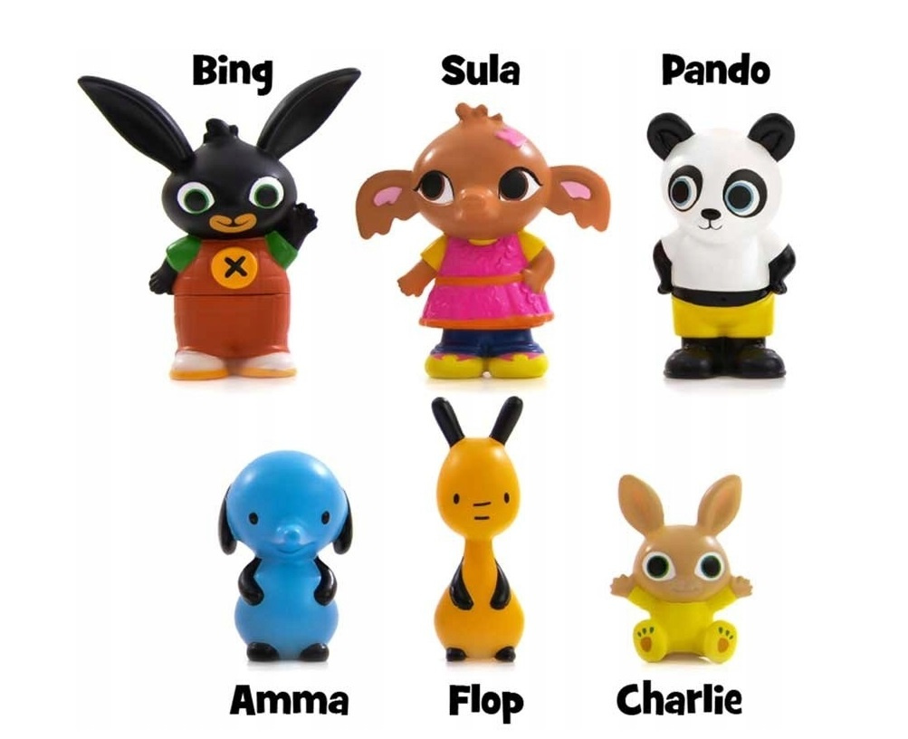 W zestawie: FLOP, królik Bing, Sula, Pando, Charlie i Amma.