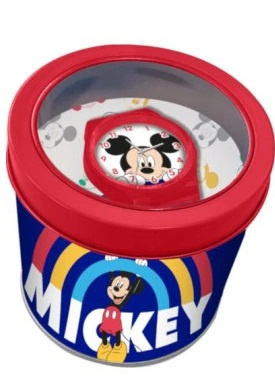 • Cyfrowy zegarek do nauki godzin i punktualności ozdobiony znaną i lubianą Myszką Miki w metalowym pudełku.