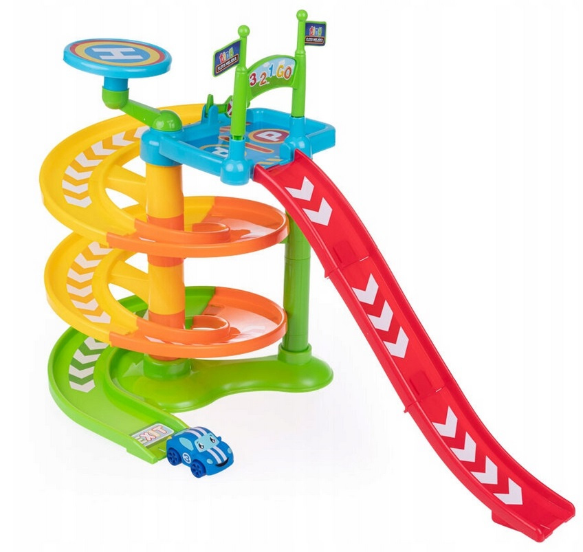 Poza torem do zjazdu, znajdziemy tu kilka dodatkowych elementów, które urozmaicą zabawę: ruchomy szlaban, miejsce parkingowe, oraz znajdujące się na szczycie zabawki, lądowisko.