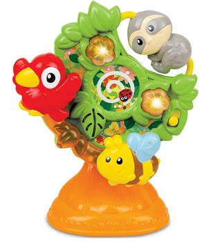 Dotknij zwierzaka i popchnij drzewko, zabawka zrobi obrót i zakończy ruch spokojnym kołysaniem. Dodatkowo w drzewku jest grzechotka i i wesołe migające światełka.