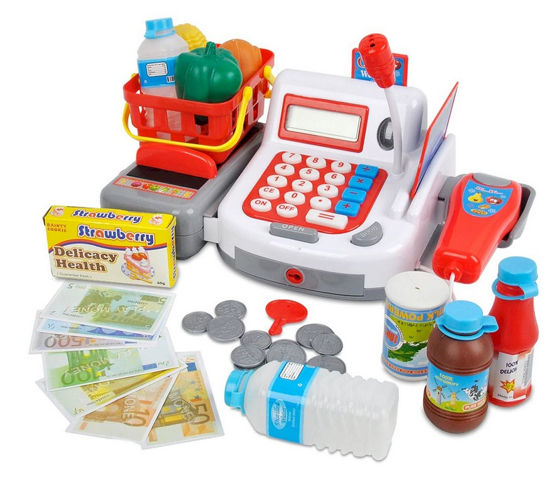 • Kasa idealna do zabawy w sklep, zakupy. W pudełku znajdziesz także koszyk z produktami oraz pieniążki i kartę.