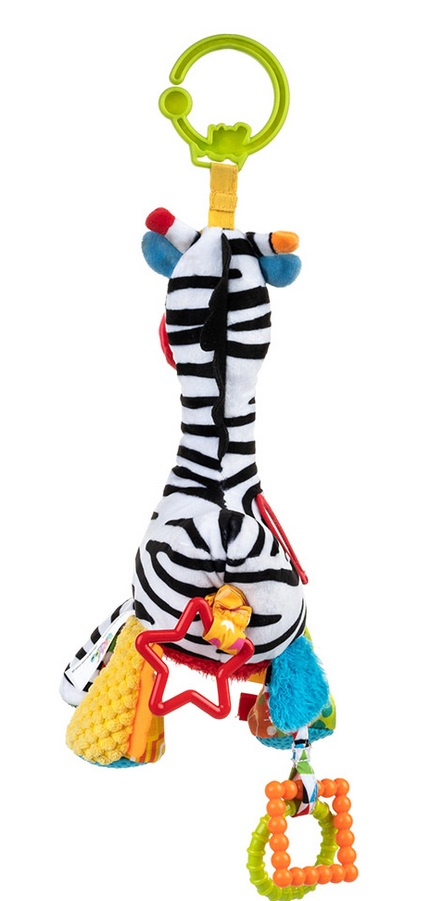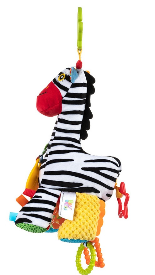 Zebra posiada dwie grzechoczące łapki, bezpieczne lusterko do samopoznania bobasa, materiałowe metki o zróżnicowanej fakturze oraz kolorowe gryzaczki, które przyniosą ulgę obolałym dziąsełkom ząbkującego dziecka.